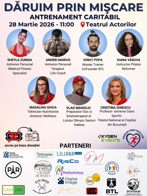 Proiectul „Dăruim prin Mișcare” propune o redefinire a conceptului de eveniment caritabil, înlocuind logica clasică a biletului plătit cu un gest de solidaritate concretă. Accesul la eveniment este condiționat exclusiv de o donație materială adusă de participant, fie că vorbim despre haine noi sau în stare foarte bună, jucării, cărți, rechizite, dulciuri sau produse de igienă. Bunurile colectate nu trec printr-un lanț lung de intermediari, ci ajung direct la familiile care au nevoie de ele, printr-un mecanism transparent și eficient construit de organizatorul Oxygen-Events. Această formulă simplifică actul de a dărui și îl face accesibil oricui, indiferent de posibilitățile financiare sau de nivelul de implicare anterioară în activități de voluntariat. Pe 28 martie 2026, începând cu ora 11:00, Teatrul Actorilor de pe Splaiul Unirii nr. 160 din București devine gazda celei de-a doua ediții a proiectului, care reunește șapte specialiști în fitness, nutriție, kinetoterapie și dans sportiv într-un program complet structurat pe sesiuni de antrenament, activări educaționale și momente de comunitate. Proiectul se adresează deopotrivă celor cu experiență în sport și celor care fac primii pași către un stil de viață activ, fiecare participant contribuind în mod egal la cauza socială prin donația adusă.